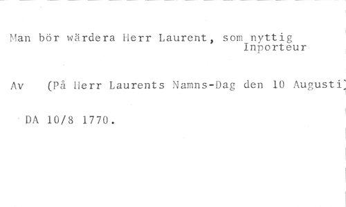 Man bör värdera Herr Laurent, som nyttig //// Inporteur //// Av (På Herr Laurents Namns-Dag den 10 Augusti //// 'DA 10/8 1770.