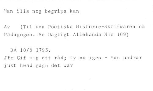 Man illa nog begripa kan //// Av (Til den Poetiska Historie-Skrifwaren om //// Pädagogen. Se Dagligt Allehanda N:o 109) //// DA 10/6 1793. //// Jfr Gif mig ett råd; ty nu igen - Man undrar just hwad gagn det war