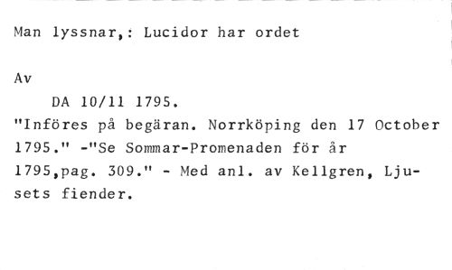 Man lyssnar,: Lucidor har ordet //// Av //// DA 10/11 1795. //// "Införes på begäran. Norrköping den 17 October 1795." -"Se Sommar-Promenaden för år //// 1795,pag. 309." - Med anl. av Kellgren, Ljusets fiender.