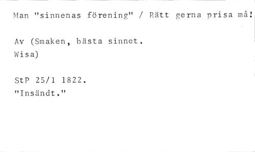 Man "sinnenas förening" / Rätt gerna prisa må!, //// Av (Smaken, bästa sinnet. Wisa) //// StP 25/1 1822. "Insändt."