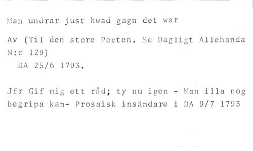 Man undrar just hwad gagn det war //// Av (Til den store Poeten. Se Dagligt Allehanda N:o 129) //// DA 25/6 1793. //// Jfr Gif mig ett råd; ty nu igen - Man illa nog begripa kan- Prosaisk insändare i DA 9/7 1793