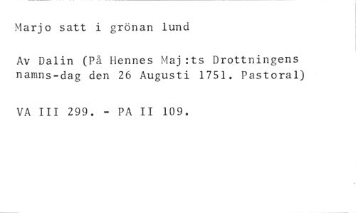 Marjo satt i grönan lund //// Av Dalin (På Hennes Maj:ts Drottningens namns-dag den 26 Augusti 1751. Pastoral) //// VA III 299. - PA II 109.