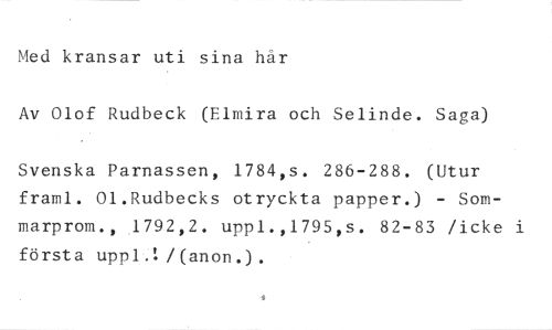 ^•led kransar uti sina hår //// Av Olof Rudbeck (Elmira och Selinde. Saga) //// Svenska Parnassen, 1784,s. 286-288. (Utur frami. 01.Rudbecks otryckta papper.) - Sommarprom., 1792,2. uppl.,1795,s. 82-83 /icke i första uppl.!/(anon.).
