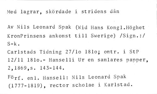 Med lagrar, skördade i stridens dån //// Av Nils Leonard Spak (Wid Hans Kongl.Höghet KronPrinsens ankomst till Swerige) /Sign.:/ S-k. //// Carlstads Tidning 27/lo 181o; omtr. i StP 12/11 181o.- Hanselli Ur en samlares papper, 2,1869,s. 143-144. //// Förf. enl. Hansell: Nils Leonard Spak (1777-1819), rector scholae i Karlstad.