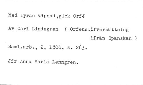 Med lyran väpnad,gick Orfe //// Av Carl Lindegren ( Orfeus.Öfversättning //// ifrån Spanskan ) //// Saml.arb., 2, 1806, s. 263. //// Jfr Anna Maria Lenngren.