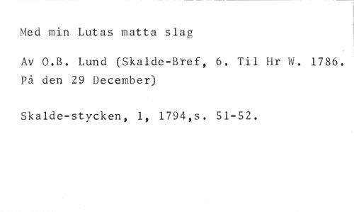 Med min Lutas matta slag //// Av O.B. Lund (Skalde-Bref, 6. Til Hr W. 1786. På den 29 December) //// Skalde-stycken, 1, 1794,s. 51-52.