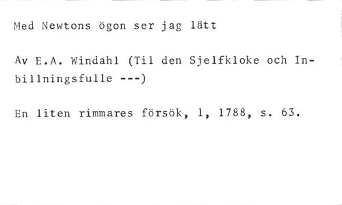Med Newtons ögon ser jag lätt //// Av E.A. Windahl (Til den Sjelfkloke och Inbillningsfulle ---) //// En liten rimmares försök, 1, 1788, s. 63.