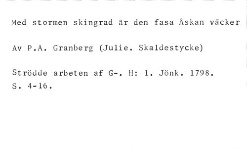 Med stormen skingrad är den fasa Åskan väcker //// Av P.A. Granberg (Julie. Skaldestycke) //// Strödde arbeten af G-. H: 1. Jönk. 1798. S. 4-16.
