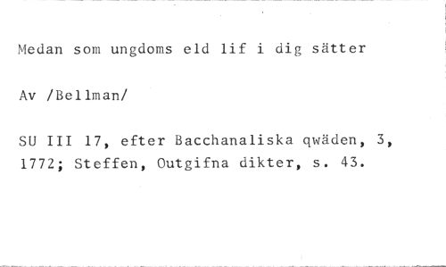Medan som ungdoms eld lif i dig sätter Av /Bellman //// /SU III 17, efter Bacchanaliska qwäden, 3, 1772; Steffen, Outgifna dikter, s. 43.