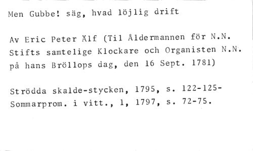Men Gubbe! säg, hvad löjlig drift //// Av Eric Peter Älf (Til Åldermannen för N.N. Stifts samtelige Klockare och Organisten på hans Bröllops dag, den 16 Sept. 1781) //// Strödda skalde-stycken, 1795, s. 122-125- Sommarprom. i vitt., 1, 1797, s. 72-75.