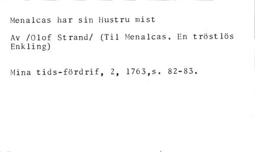 Menaleas har sin Hustru mist //// Av /Olof Strand/ (Til Menalcas. En tröstlös Enkling) //// Mina tids-fördrif, 2, 1763,s. 82-83.