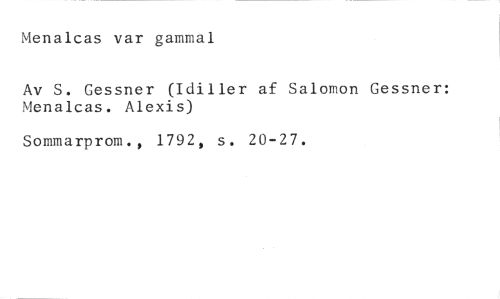 Menalcas var gammal //// Av S. Gessner (Idiller af Salomon Gessner: Menaicas. Alexis) //// Sommarprom., 1792, s. 20-27.