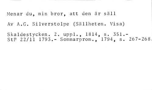 Menar du, min bror, att den är säll //// Av A.G. Silverstolpe (Sällheten. Visa) //// Skaldestycken. 2. uppl., 1814, s. 351.- //// StP 22/11 1793.- Sommarprom., 1794, s. 267-268,