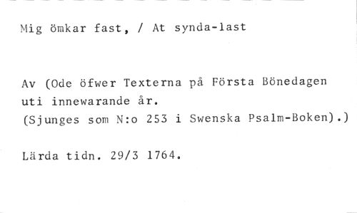 Mig ömkar fast, / At synda-last //// Av (Ode öfwer Texterna på Första Bönedagen uti innewarande år. //// (Sjunges som N:o 253 i Swenska Psalm-Boken).) //// Lärda tidn. 29/3 1764.