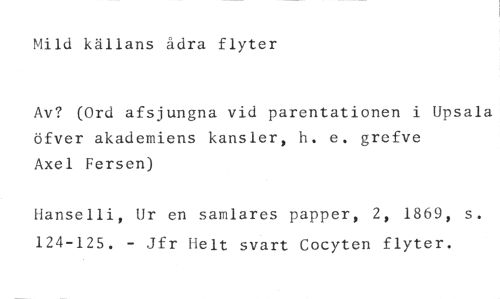 Mild källans ådra flyter //// Av? (Ord afsjungna vid parentationen i Upsala öfver akademiens kansler, h. e. grefve Axel Fersen) //// Hanselli, Ur en samlares papper, 2, 1869, s. 124-125. - Jfr Helt svart Cocyten flyter.