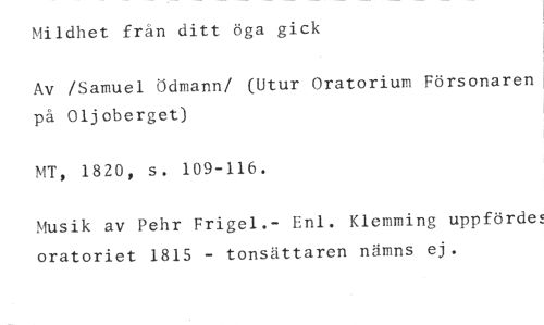 Mildhet frän ditt öga gick //// Av /Samuel Ödmann/ (Utur Oratorium Försonaren pä Oljoberget) //// MT, 1820, s. 109-116. //// Musik av Pehr Frigel.- Enl. Klemming uppförde; oratoriet 1815 - tonsättaren nämns ej.