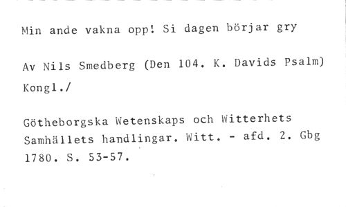 Min ande vakna opp! Si dagen börjar gry //// Av Nils Smedberg (Den 104. K. Davids Psalm) Kongl. //// /Götheborgska Wetenskaps och Witterhets Samhällets handlingar. Witt. - afd. 2. Gbg 1780. S. 53-57.