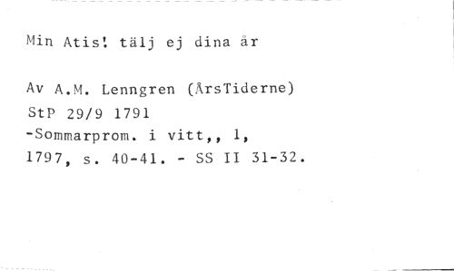 Min Atist tälj ej dina är //// Av A.M. Lenngren (ÅrsTiderne) //// StP 29/9 1791 //// -Sommarprom. i vittp, 1, //// 1797, s. 40-41. - SS II 31-32.