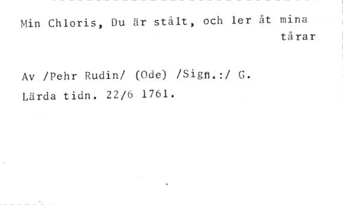 Min Chloris, Du är stält, och ler åt mina //// tårar //// Av /Pehr Rudin/ (Ode) /Sign,:/ G. Lärda tidn. 22/6 1761.