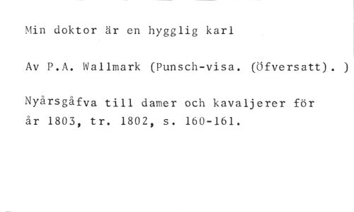 Min doktor är en hygglig karl //// Av P.A. Wallmark (Punsch-visa. (Öfversatt). ) //// Nyårsgåfva till damer och kavaljerer för år 1803, tr. 1802, s. 160-161.