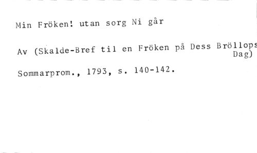 Min Fröken! utan sorg Ni går //// Av (Skalde-Bref til en Fröken på Dess Bröllop! //// Dag) //// Sommarprom., 1793, s. 140-142.