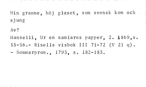 Min granne, höj glaset, som svensk kom och sjung //// Av? //// Hanselli, Ur en samlares papper, 2. 1869,s. 55-56.- Risells visbok III 71-72 (V 21 q). - Sommarprom., 1793, s. 182-183.