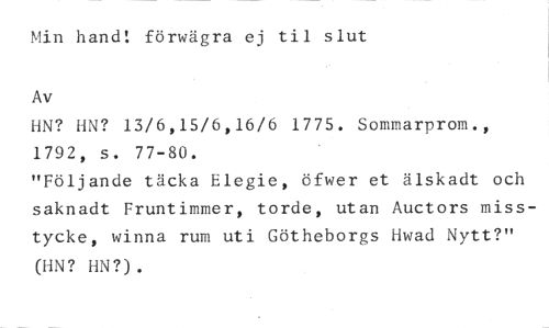Min hand! förwägra ej til slut //// Av //// HN? HN? 13/6,15/6,16/6 1775. Sommarprom., 1792, s. 77-80. //// "Följande täcka Elegie, öfwer et älskadt och saknadt Fruntimmer, torde, utan Auctors misstycke, winna rum uti Götheborgs Hwad Nytt?" (HN? HN?).