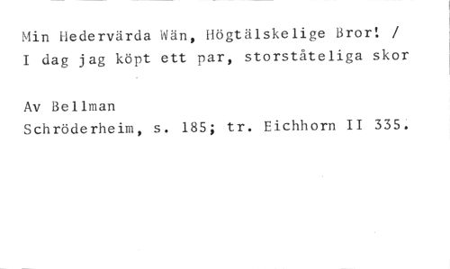 Min hedervärda olän, Högtälskelige Bror! / I dag jag köpt ett par, storståteliga skor //// Av Bellman //// Schröderheim, s. 185; tr. Fichhorn II 335.