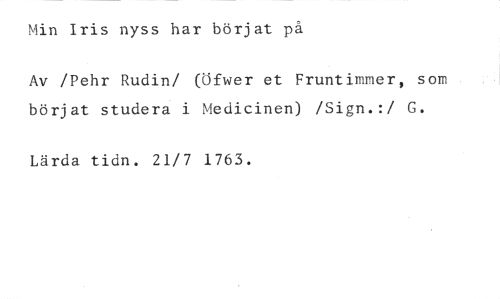 Min Iris nyss har börjat på //// Av /Pehr Rudin/ (fwer et Fruntimmer, som börjat studera i Medicinen) /Sign.:/ G. //// Lärda tidn. 21/7 1763.