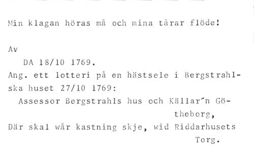 Min klagan höras må och mina tårar flöde: //// Av //// DA 18/10 1769. //// Ang. ett lotteri på en hästsele i Bergstrahlska huset 27/10 1769: //// Assessor Bergstrahls hus och Källar'n Gö- //// theborg, //// Där skal wår kastning skje, wid Riddarhusets //// Torg.