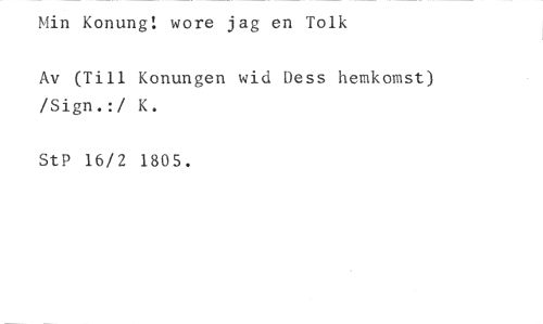 Min Konung! wore jag en Tolk //// Av (Till Konungen wid Dess hemkomst) /Sign.:/ K. //// StP 16/2 1805.