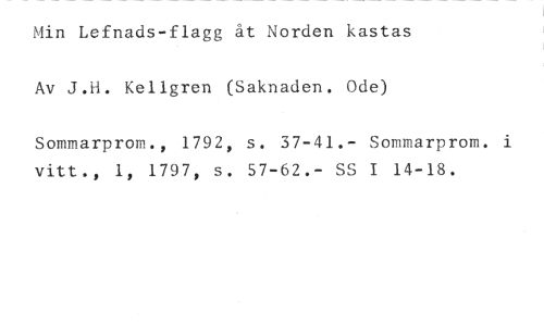 Min Lefnads-flagg åt Norden kastas //// Av J.H. Kellgren (Saknaden. Ode) //// Sommarprom., 1792, s. 37-41.- Sommarprom. i vitt., 1, 1797, s. 57-62.- SS I 14-18.