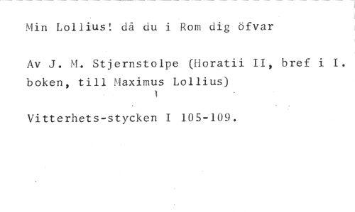 Min Lollius! då du i Rom dig öfvar //// Av J. M. Stjernstolpe (Horatii II, bref i I. boken, till Maximus Lollius) //// Vitterhets-stycken I 105-109.
