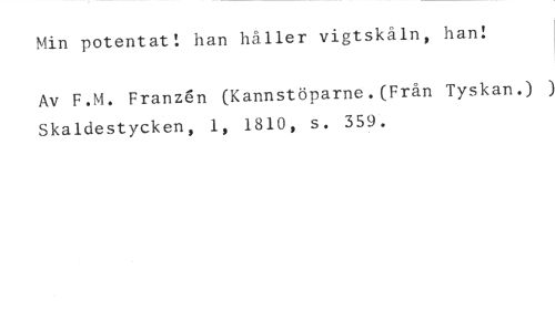 Min potentat! han håller vigtskåln, han! //// Av F.M. Franzén (Kannstöparne.(Från Tyskan.) ) Skaldestycken, 1, 1810, s. 359.