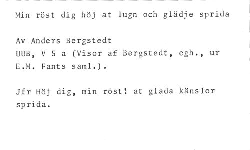 Min röst dig höj at lugn och glädje sprida //// Av Anders Bergstedt //// UUB, V 5 a (Visor af Bergstedt, egh., ur E.M. Fants saml.). //// Jfr Höj dig, min röst! at glada känslor sprida.