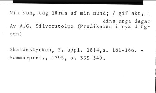 Min son, tag läran af min mund; / gif akt, i //// dina unga dagar //// Av A.G. Silverstolpe (Predikaren i nya dräg- //// ten) //// Skaldestycken, 2. uppl. 1814,s. 161-166. - Sommarprom., 1795, s. 335-340.