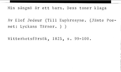 Min sångmö är ett barn. Dess toner klaga //// Av Elof Jedeur (Till Euphrosyne. (Jämte Poemet: Lyckans Tärnor. ) ) //// Witterhetsförsök, 1825, s. 99-100.