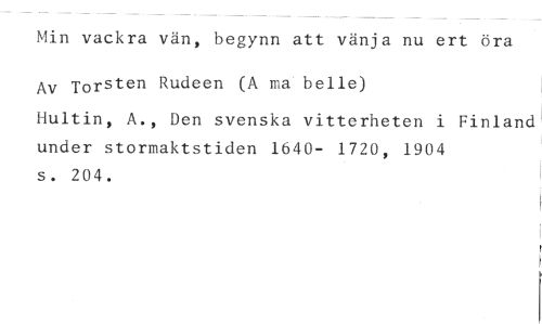 Min vackra vän, begynn att vänja nu ert öra Av Tors ten Rudeen (A ma belle) //// Hultin, A., Den svenska vitterheten i Finland under stormaktstiden 1640- 1720, 1904 s. 204.