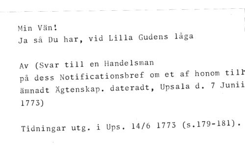 Min Vän: //// Ja så Du har, vid Lilla Gudens låga //// Av (Svar till en Handelsman //// på dess Notificationsbref om et af honom till ämnadt Ägtenskap. dateradt, Upsala d. 7 Junii 1773) //// Tidningar utg. i Ups. 14/6 1773 (s.179-181).