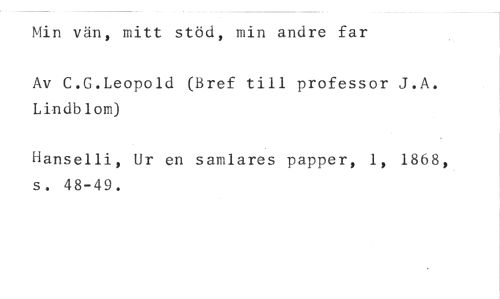 Min vän, mitt stöd, min andre far //// Av C.G.Leopold (Bref till professor J.A. Lindblom) //// Hanselli, Ur en samlares papper, 1, 1868, s. 48-49.