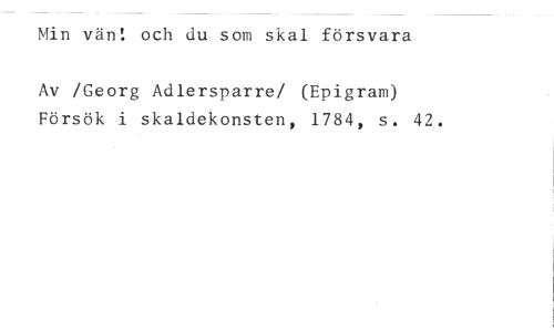 Min vän: och du som skal försvara //// Av /Georg Adlersparre/ (Epigram) Försök i skaldekonsten, 1784, s. 42.