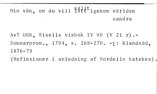 Min vän, om du vill fllitigenom världen //// vandra //// Av? UUB, Risells visbok IV 90 (V 21 r).- //// Sommarprom., 1794, s. 269-270. Blandsäd, //// 1876-79 //// (Reflexioner i anledning af Nordells katekes).