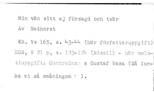 ^MM 1~111MIEMIIIEM //// Min vän sitt ej försagd och tvär Av Nathorst //// KB, Vs 165, s. 43-44 (här författaruppgift){ UUB, V 21 p, s. 123-124 (Risen) - här nielo- //// diuppgift: Contradan 1 s Gustaf Vasa (Så lunka vi så småningom / ).