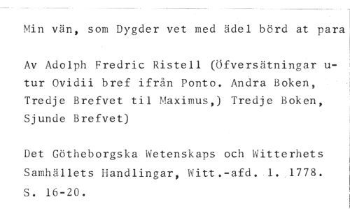Min vän, som Dygder vet med ädel börd at para //// Av Adolph Fredric Ristell (Öfversätningar utur Ovidii bref ifrån Ponto. Andra Boken, Tredje Brefvet til Maximus,) Tredje Boken, Sjunde Brefvet) //// Det Götheborgska Wetenskaps och Witterhets Samhällets Handlingar, Witt.-afd. 1. 1778. S. 16-20.