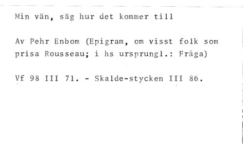 Min vän, säg hur det kommer till //// Av Pehr Enbom (Epigram, om visst folk som prisa Rousseau; i hs ursprungl.: Fråga) //// Vf 98 III 71. - Skalde-stycken III 86.