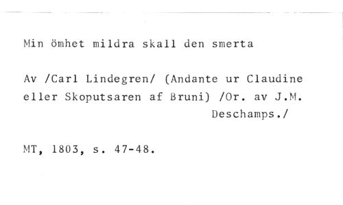 Min ömhet mildra skall den smerta //// Av /Carl Lindegren/ (Andante ur Claudine eller Skoputsaren af Bruni) /Or. av J.M. //// Deschamps. //// /MT, 1803, s. 47-48.