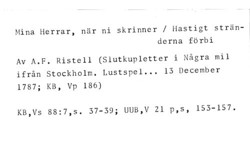 Mina Herrar, när ni skrinner / Hastigt strän- //// derna förbi //// Av A.F. Ristell (Slutkupletter i Några mil ifrån Stockholm. Lustspel... 13 December 1787; KB, Vp 186) //// KB,Vs 88:7,s. 37-39; UUB,V 21 p,s, 153-157.