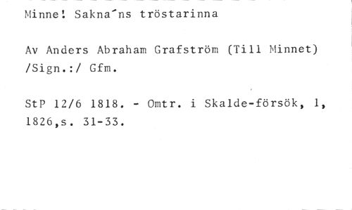 Minne! Sakna'ns tröstarinna //// Av Anders Abraham Grafström (Till Minnet) /Sign.:/ Gfm. //// StP 12/6 1818. - Omtr. i Skalde-försök, 1, 1826,s. 31-33.