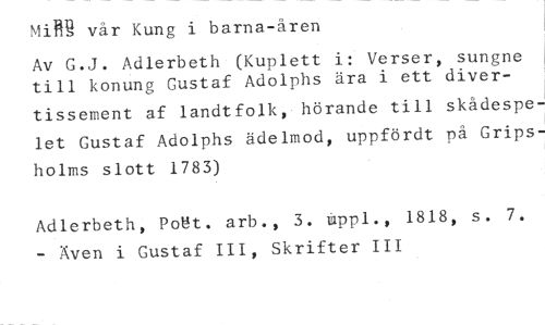 MiRR vår Kung i barna-åren //// Av G.J. Adlerbeth (Kuplett i: Verser, sungne till konung Gustaf Adolphs ära i ett diver- //// tissement af landtfolk, hörande till skådespelet Gustaf Adolphs ädelmod, uppfördt på Gripsholms slott 1783) //// Adlerbeth, Post. arb., 3. uppl., 1818, s. 7. - Även i Gustaf III, Skrifter III