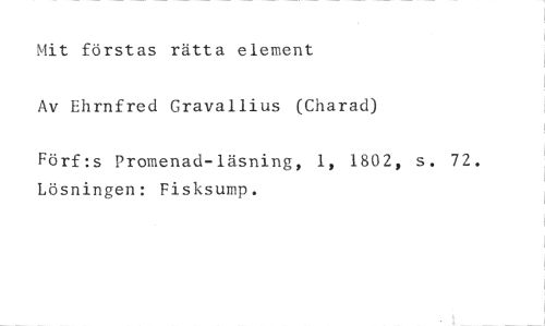 Mit förstas rätta element //// Av Ehrnfred Gravallius (Charad) //// Förf:s Promenad-läsning, 1, 1802, s. 72. Lösningen: Fisksump.